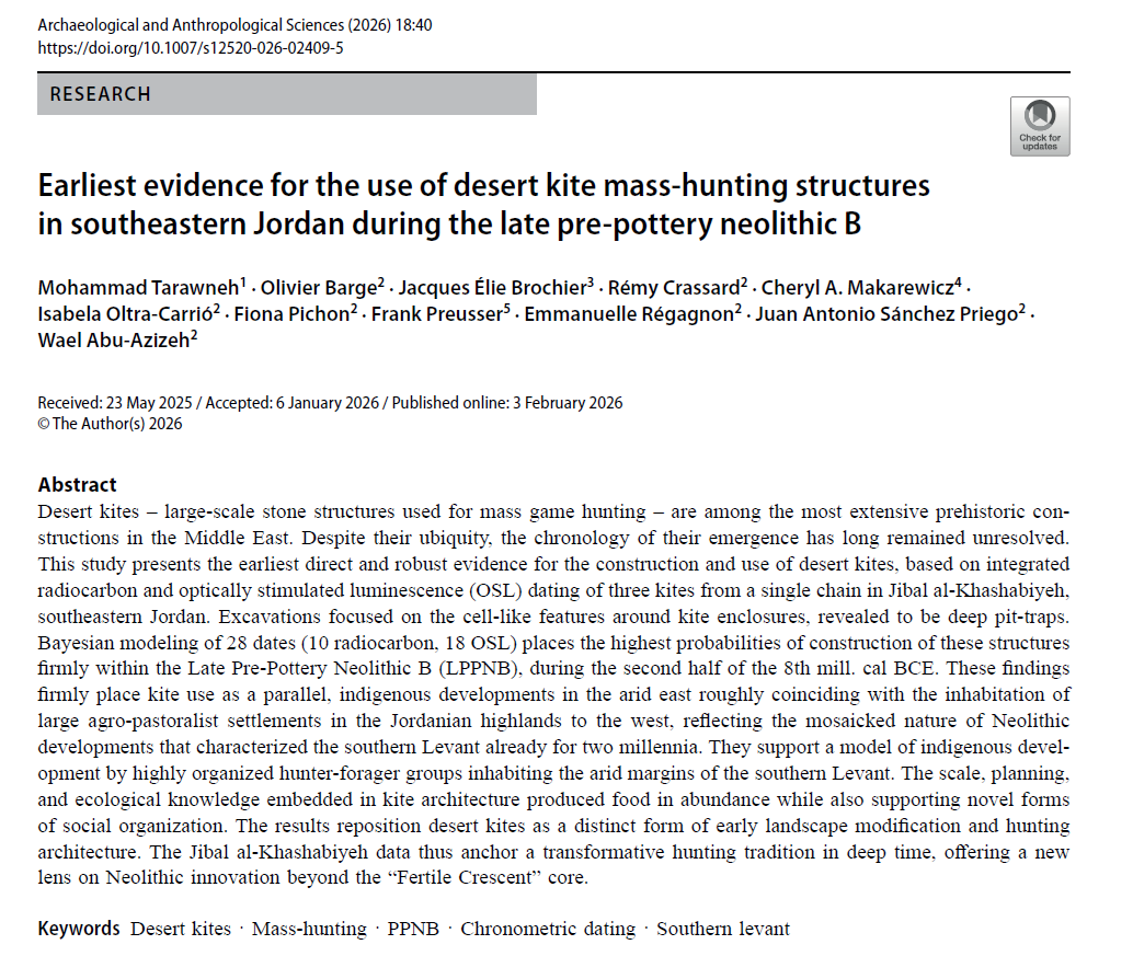 Congratulations to Prof. Cheryl Makarewicz et al. on their new paper "Earliest evidence for the use of desert kite mass-hunting structures in southeastern Jordan during the late pre-pottery neolithic B" published in Archaeological and Anthropological Sciences. The paper presents the earliest robust dates for desert kites based on radiocarbon and optically stimulated luminescence (OSL) dating of three desert kites from Jibal al-Khashabiyeh in southeastern Jordan, placing their construction firmly in the Late Pre-Pottery Neolithic B. The study also confirms that the circular features around the kite enclosures are deep pit-traps for capturing game, supporting their interpretation as large-scale mass-hunting installations built by organized hunter-forager communities in the southern Levant, roughly contemporary with the rise of large farming villages in the Jordanian highlands.